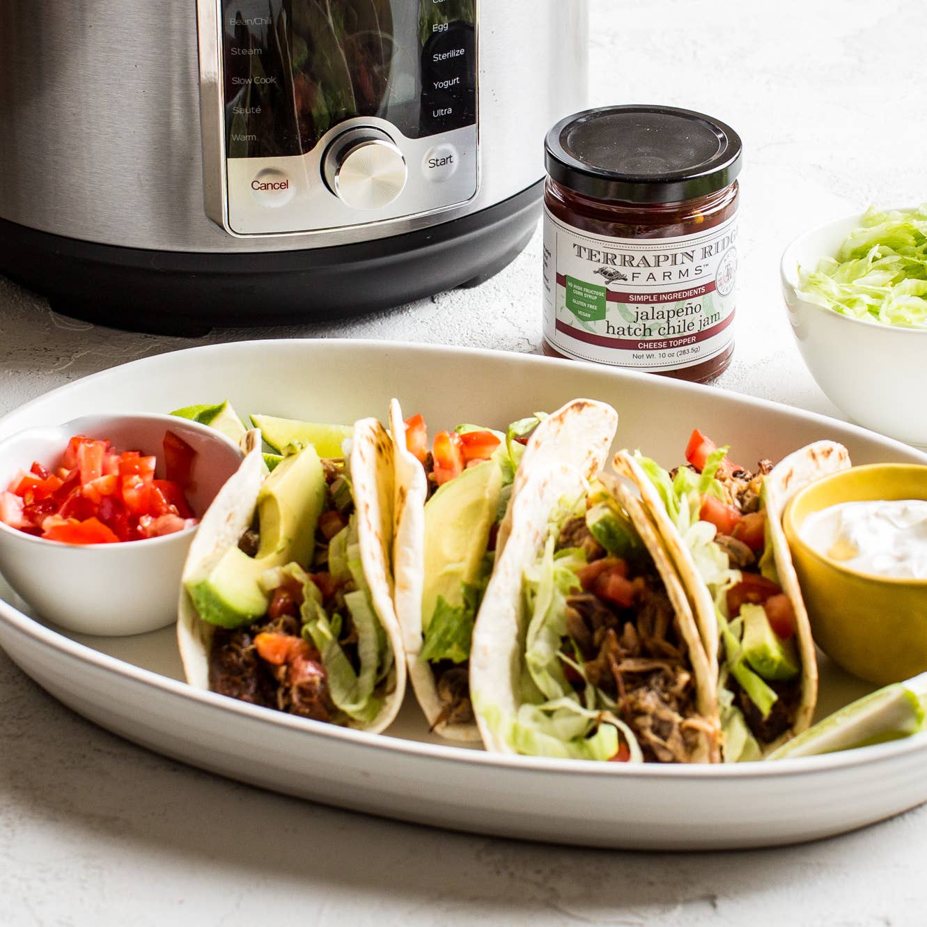 Jalapeño and Hatch chili peppers create the perfect combination of sweet and savory. Pour on top of cream cheese and serve with crackers for a tasty appetizer. Great as a burger or brat topping. Delicious folded into scrambled eggs and mashed sweet potatoes or use as a glaze for grilled or baked fish or chicken.