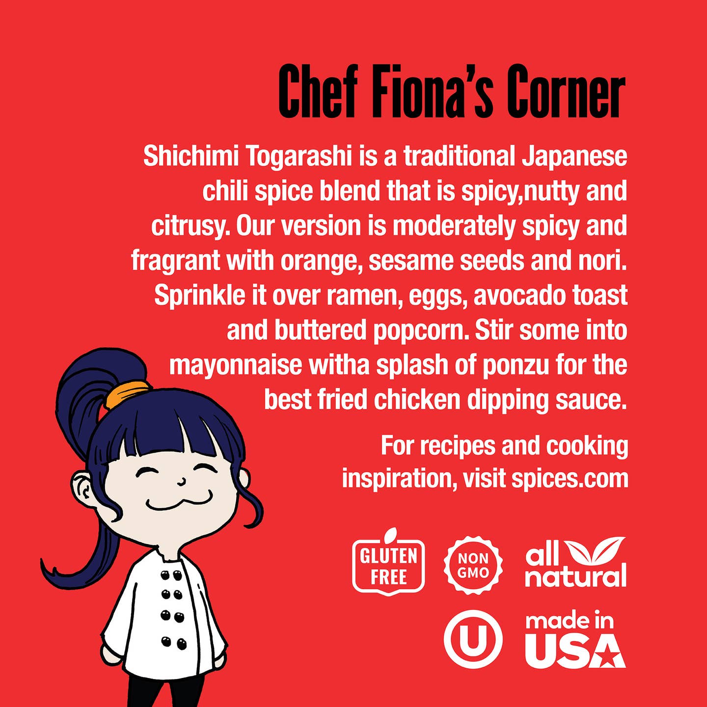 • Shichimi Togarashi is a Japanese pepper blend that is often found on the table at ramen shops and yakitori restaurants. • FLAVOR & USE: Shichimi Togarashi is a traditional Japanese chili spice blend that is spicy, nutty and citrusy. Our version is moderately spicy and fragrant with orange, sesame seeds and nori. Sprinkle it over ramen, eggs, avocado toast and buttered popcorn. Stir some into mayonnaise with a splash of ponzu for the best fried chicken dipping sauce.
